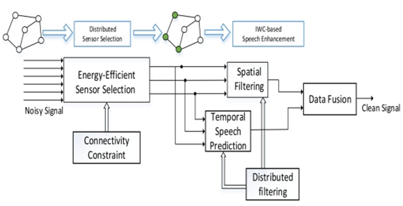In response to these issues, the paper proposes a new distributed energy-saving speech enhancement method based on WASN. Unlike existing beamforming methods, this paper utilizes both the temporal and spatial characteristics of speech signals, and uses information weighted filters to suppress environmental noise and interference noise in a distributed manner. Furthermore, this article proposes a new node selection strategy that selects nodes with significant contributions for speech enhancement, thereby achieving a good balance between performance and energy consumption.