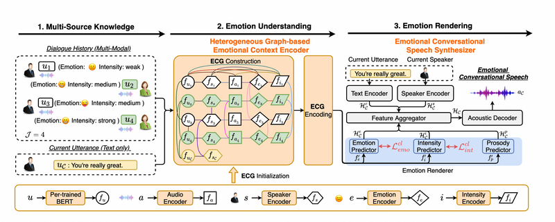 First, in terms of emotion understanding in conversation, a heterogeneous graph-based emotional context modeling mechanism is introduced to model the context of conversation with the multi-source conversation history knowledge like conversation texts, voices, identities of speakers, emotion categories and emotion intensity as input, to exactly understand the emotional clues in conversation context. Second, in light of emotion rendering in conversation, the contrastive learning-based emotion rendering module is proposed to precisely infer the emotion style of the target speech so as to accurately render the conversational emotion. The results of the experiments showed that the model proposed in this research is greatly superior to the baseline model in the naturalness and emotional expressiveness of the speech in the conversation. It provides a new path for the development of conversational artificial intelligence.
