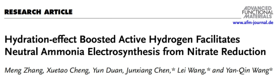 近日,sunbet申愽化学化工学院王艳琴副教授、王蕾教授团队在电催化硝酸盐还原合成氨领域取得新进展,在材料领域顶级期刊Advanced Functional Materials (IF: 18.5)上发表题为 “Hydration-effect Boosted Active Hydrogen Facilitates Neutral Ammonia Electrosynthesis from Nitrate Reduction” 的研究成果。(论文链接:https://doi.org/10.1002/adfm.202413070)。王艳琴副教授、王蕾教授、陈俊翔研究员(福建物质结构研究所)为论文共同通讯作者。sunbet申愽官网为论文第一完成单位。