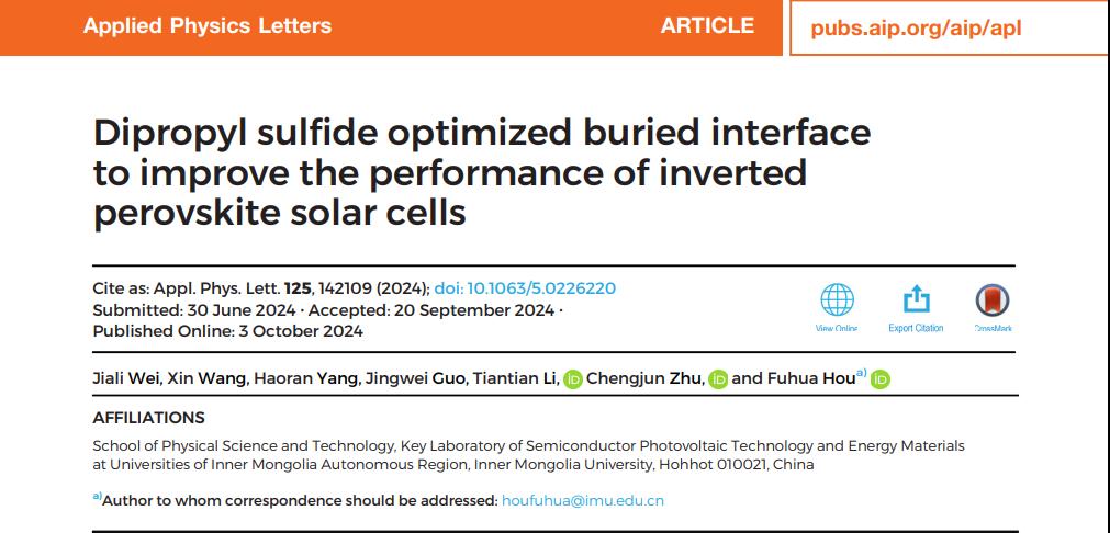 近日,sunbet申愽物理科学与技术学院侯福华研究员课题组在基于氧化镍的倒置钙钛矿太阳电池的埋底界面调控方面取得了最新进展。研究成果以“Dipropyl sulfide optimized buried interface to improve the performance of inverted perovskite solar cells”为题,发表于学科卓越期刊《Applied Physics Letters》(nature指数收录)上,论文链接:https://doi.org/10.1063/5.0226220。