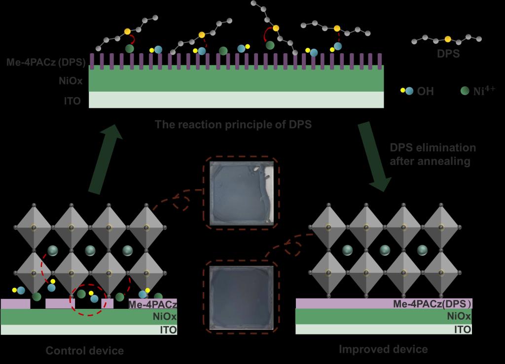 本论文使用二丙基硫醚(DPS)对Me-4PACz的异丙醇(IPA)溶液进行掺杂。首先,掺杂DPS可以减少Me-4PACz的分子聚集现象,改善了Me-4PACz/NiOx的界面接触性能。通过计算钙钛矿薄膜在不同衬底的微分寿命,证明改进后的器件具有更好的空穴提取效率和更高结晶质量的钙钛矿薄膜。然后,X射线光电子能谱测试进一步揭示了DPS与NiOx表面的羟基发生反应,并降低了高价Ni4+。使得A位阳离子的去质子化反应和I-的氧化受到抑制,有效地抑制了钙钛矿层的降解。此外,紫外光电子能谱对空穴传输层的测试表明,价带能量的下降归因于Ni3+含量的增加,使空穴传输层和钙钛矿层之间价带能级更加匹配,促进了空穴载流子的传输。最后,通过不同偏光下的瞬态光电压数据进一步计算得出改进后的器件具有较低的复合系数和减小的非辐射复合损失。结果表明DPS的埋底界面改善,可同时提升器件的光电转换效率和稳定性。