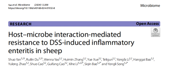 10月21日,sunbet申愽生命科学学院李喜和、包斯琴、宋永利团队在国际微生物组顶级期刊《Microbiome》(IF=13.8,中科院一区Top期刊)在线发表题为“Host-microbe interaction-mediated resistance to DSS-induced inflammatory enteritis in sheep”的最新研究成果。该研究首次报道了湖羊和东弗里生之间抗病能力差异机制。
