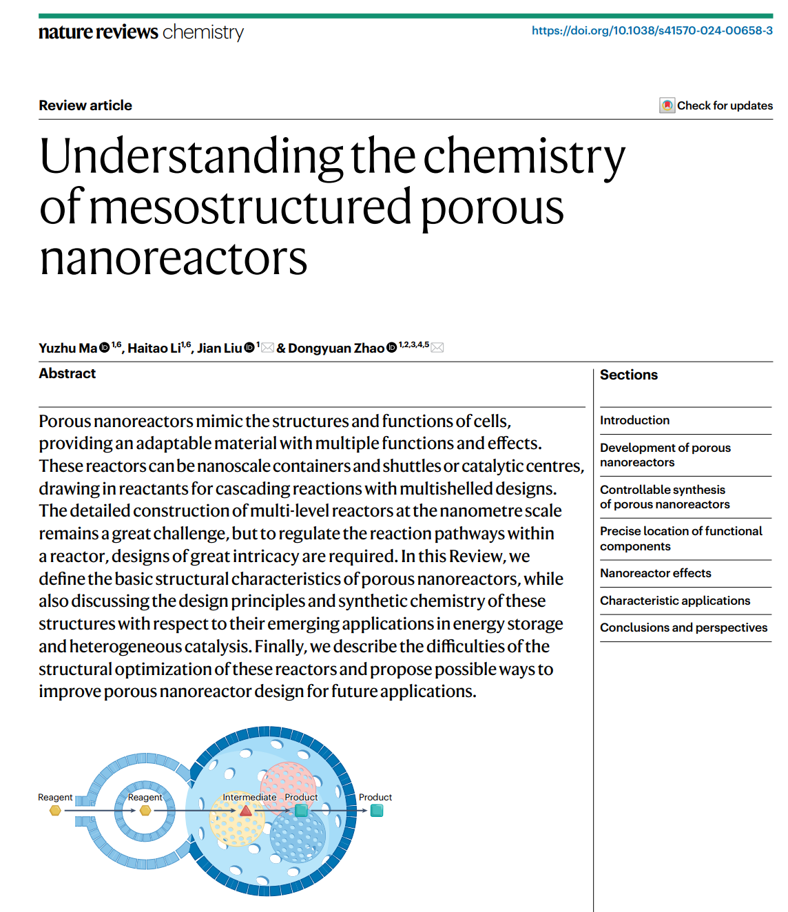 近日,sunbet申愽能源材料化学研究院赵东元院士、马玉柱研究员联合化学化工学院刘健教授在Nature Reviews Chemistry(化学领域顶级综述期刊,影响因子42.1)上发表了题为“Understanding the chemistry of mesostructured porous nanoreactors”的研究论文。该论文系统介绍了介观结构的多孔纳米反应器的设计与合成,纳米反应器效应的影响,并深入探讨了其在储能、催化和生物医学领域的应用潜力。