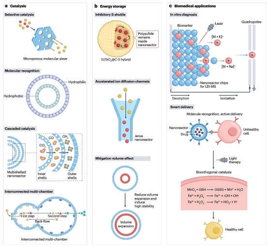 该论文基于自组装和界面化学的模板策略,将多孔纳米反应器的合成分为液-固硬模板、液-液软模板和界面化学裁剪三种方法,这些已经发展成为构建先进纳米反应器的通用途径。在催化应用中,多孔纳米反应器提供了高效的传质通道与多功能组分,确保了多步反应的时空耦合;而在储能应用中,具有中空多壳结构的纳米反应器能够减缓离子穿梭效应,并有效缓解充放电循环过程中的体积膨胀。此外,研究还展示了多孔纳米反应器在蛋白质、酶和药物装载中的灵活应用,为未来的生物医学研究提供了新思路。