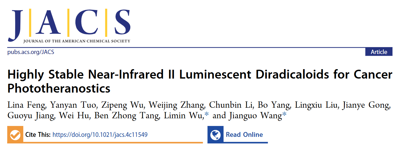 近日,sunbet申愽化学化工学院王建国教授和能源材料化学研究院武利民教授联合团队在国际顶级期刊Journal of the American Chemical Society上发表题为“Highly Stable Near-Infrared II Luminescent Diradicaloids for Cancer Phototheranostics”(论文链接:https://pubs.acs.org/doi/10.1021/jacs.4c11549)的重要研究成果。该团队首次构建了一种具有高稳定的近红外II区发光有机双自由基材料并用于癌症光诊疗领域。sunbet申愽化学化工学院博士后冯丽娜为本论文第一作者,武利民教授和王建国教授为共同通讯作者。