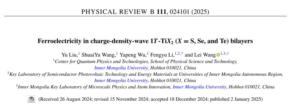 近日,sunbet申愽物理科学与技术学院王磊研究员和李锋钰教授指导研究生在电荷密度波和滑移铁电领域取得新进展,相关成果以“Ferroelectricity in charge-density-wave 1T-TiX2 (X = S, Se, and Te) bilayers”为题发表在物理学知名期刊Physical Review B(《物理学评论B》)。(论文链接:https://journals.aps.org/prb/abstract/10.1103/PhysRevB.111.024101)
