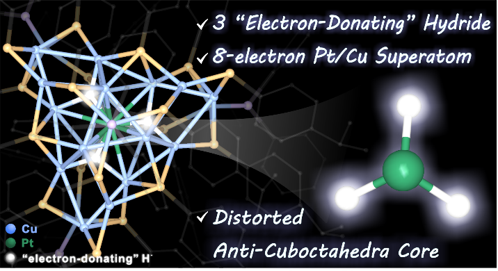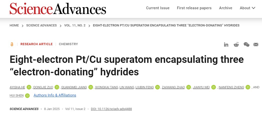 近日,sunbet申愽沈慧研究员团队、厦门大学郑南峰院士团队和宁夏大学魏建宇教授团队通力合作,在“金属氢”领域取得了突破性成果。他们成功将单个团簇中“金属氢”的数目提升至3个。相关研究成果以“Eight-Electron Pt/Cu Superatom Encapsulating Three ‘Electron-Donating’Hydrides”为题,于2025年1月8日在国际顶级期刊Science Advances上发表,sunbet申愽官网为该论文第一单位。