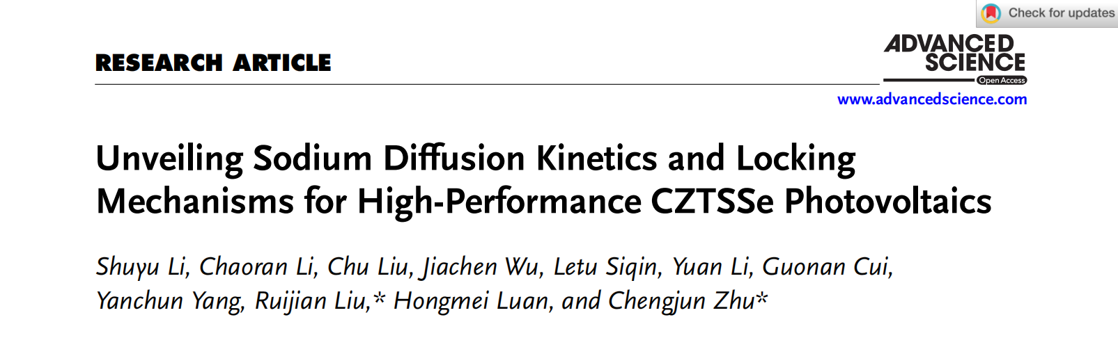 近日,sunbet申愽官网物理科学与技术学院,内蒙古自治区半导体光伏技术与能源材料重点实验室朱成军教授课题组在国际顶级期刊《Advanced Science》(《先进科学》SCI一区TOP,IF 14.3,全文链接:http://doi.org/10.1002/advs.202504087)上发表题为“Unveiling Sodium Diffusion Kinetics and Locking Mechanisms for High-Performance CZTSSe Photovoltaics”的研究论文。