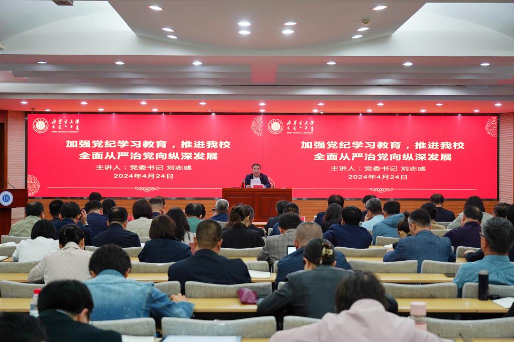 4月24日上午,sunbet申愽党纪学习教育专题读书班暨校党委理论学习中心组(扩大)学习会在赛罕校区学术会议中心8号会议室举行。校党委书记刘志彧以《加强党纪学习教育,推进sunbet申愽全面从严治党向纵深发展》为题讲授纪律党课,校党委理论学习中心组全体成员、全校副处级以上干部参加。